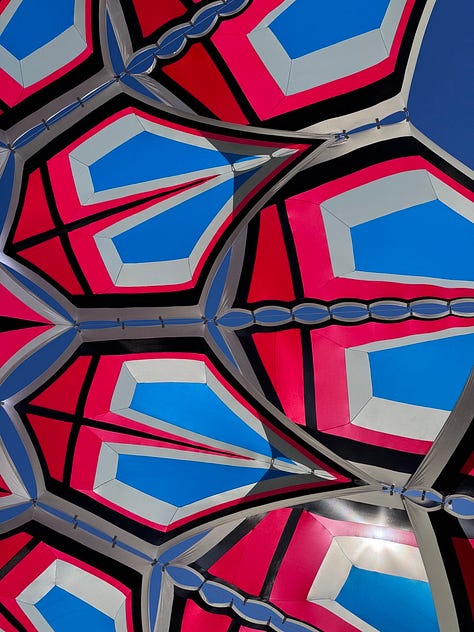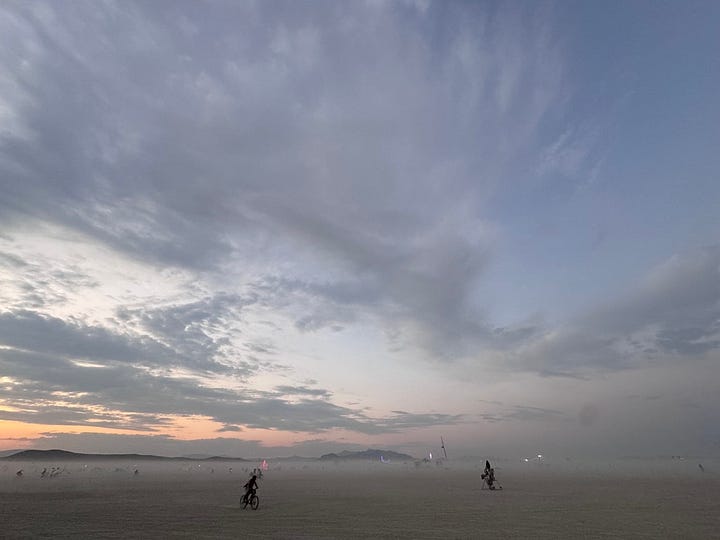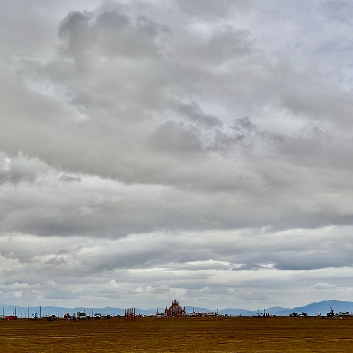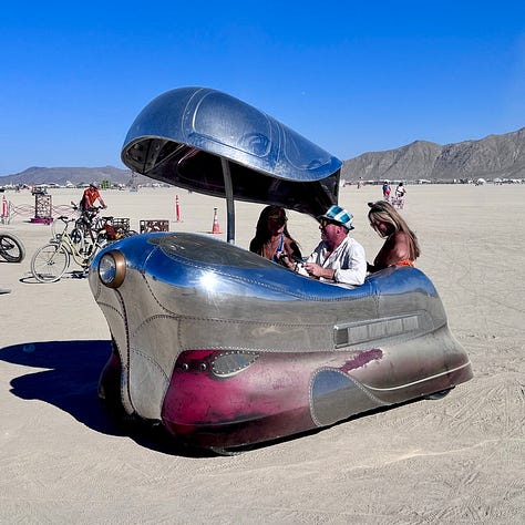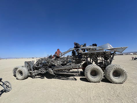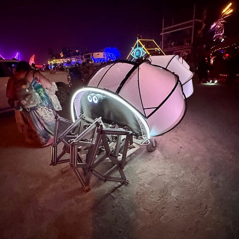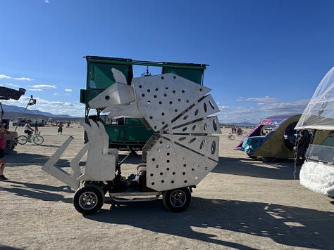 This kind of camping is not unlike a bluegrass festival (some combination of glamping and car camping while still at the mercy of the elements), yet the Black Rock Desert is far more hostile. We experienced 45mph winds (creating white-out conditions of dust), low 50’s at night, 90+ in the day, a bit of rain, and a ton of sun. That said, 2024 is supposedly one of the more pleasant Burns weather-wise. The Playa dust is alkaline, and Burners bring a vinegar solution to spray on their feet to avoid skin damage. This higher pH environment inhibits bacterial growth, making it relatively clean and unstinky (though always dusty). It is also persistent and pernicious, clinging to everything. Once home, I had to hose off my tent twice and then wipe it down with vinegar to clean it. Speaking of tents — I bought a special tent designed by Burners for Burning Man called a Shiftpod. I’d never seen them anywhere before, but I saw thousands in Black Rock City. While a bit bulky, it's an excellent tent for most car-camping adventures.