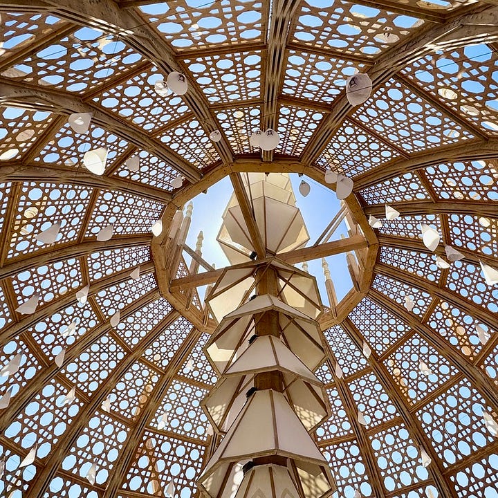 Another piece called “Nova Heaven” was a tribute to the victims of the Super Nova Festival massacre on October 7 in Israel. The artists recreated the festival's massive, gorgeous shade structure and built several wooden spiral staircases underneath it. Each of the 407 steps had a victim's name on it, of which half were Burners (many Israelis go to Burning Man).