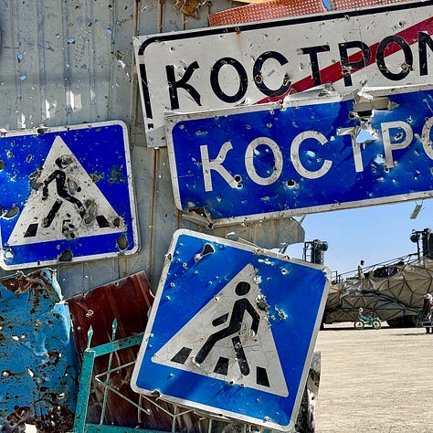 One piece in particular called “I’m Fine” deeply struck me. The piece had 20ft high letters constructed of Ukranian roadsigns riddled with bullet holes. The premise is we casually answer “I’m fine” when asked how we are, even when that is not the case. And in Ukraine, things are not “fine.” I also read that many Ukrainians text “I’m fine:)” to tell loved ones they are alive. Lastly, an air raid siren would blast on the Playa whenever one sounded in Ukraine.