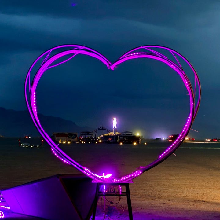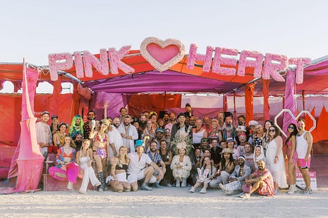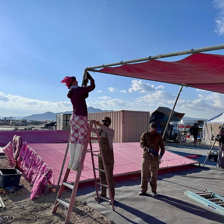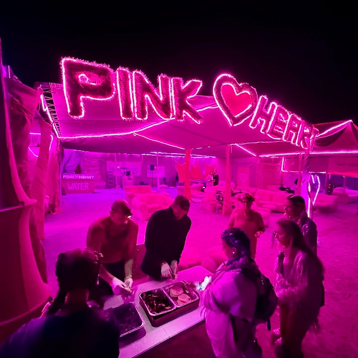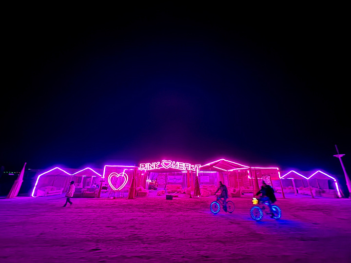 I arrived a few days before the official start for “Build Week.” Our camp stores two shipping containers in Gerlach (the nearest town) full of shade structures, pink sofas, pink lights, industrial carpets, and more. These get dropped off on our plot a week or two before we arrive. Over a few days, we constructed our camp using ratchet straps, zip ties, 18” lag bolts drilled into the Playa, and thousands of LED lights. We had a gorgeous kitchen, a generator for electricity, a swamp cooler, a private portapotty (this is important!), one camp meal a day, and a vast shade structure over our tents (also important). The Pink Heart vibe is inclusive, kind, giving, and fun. I feel eminently fortunate to have found this group and stay there for my first Burn.