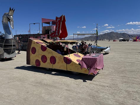 These blew my mind, from the gigantic Mayan Warrior sound stage to the fever-dream road warrior vehicles to El Pulpo Magnifico to the Pizza Car (with pizza ovens in the back giving away fresh hot pizza) to the remote-control hermit crab (with the controller riding an electric Onewheel behind it!). The diversity, scope, ambition, creativity, vision, and ingenuity to make these things and bring them to the middle of nowhere to give rides around Playa for other’s pure enjoyment is inconceivably beautiful. Early in the week, I biked over to the DMV (Department of Mutant Vehicles) and found dozens of art cars lined up (all the vehicles need permits to drive both during the day and at night). I cried as I rode around, in awe that these people share their talents and bring these gifts for us to enjoy. Not a day passed where I did not stop everything and say, “Wow, look at that!” at some new art car I’d not yet seen. In fact, I said, “Wow, look at that!” at least 3000 times during the week.